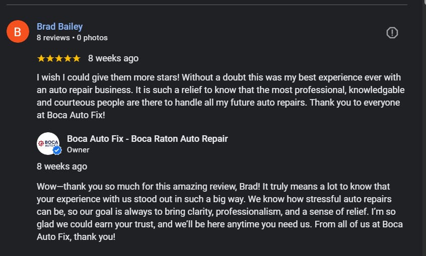 Real Reply: – “Hey Jason, we really appreciate you trusting us with your F-150 and giving us a shot on the front-end suspension rebuild. Glad to hear everything’s feeling solid now. We’ll be here if you need anything else. Thanks again for the kind words.”