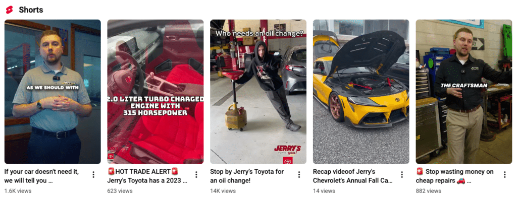 As mentioned above, Chris Luoma from Jerry’s Automotive in Lansing, MI, posts multiple videos per week. He’s hired a local videographer who specializes in shorts and YouTube content. It’s planned, it’s strategic, and some of his videos are going viral. He’s treating it like a serious marketing channel, and it’s paying off.